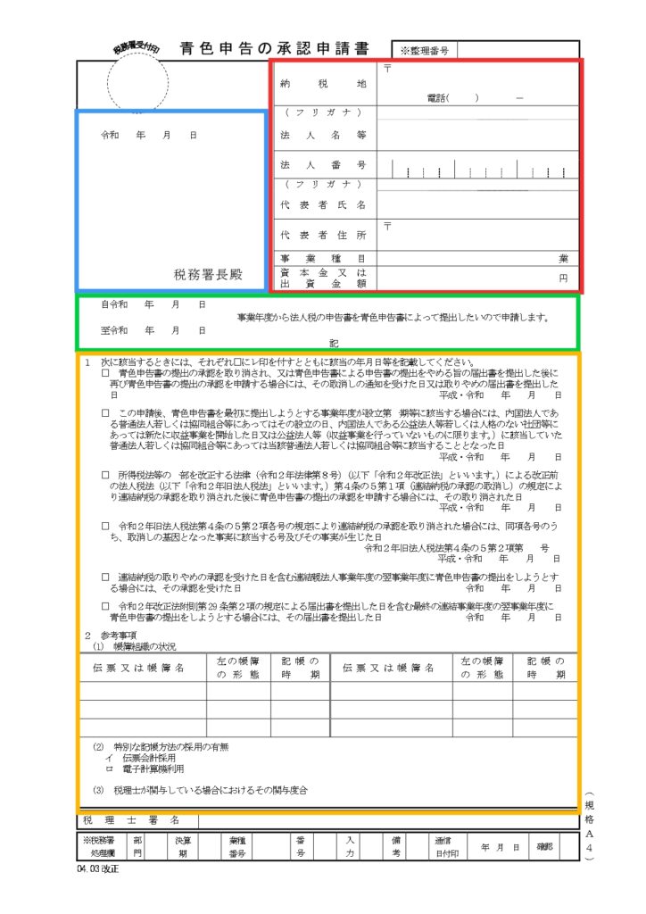 青色申告承認申請書の記載箇所は大きく4つにわけることができます。